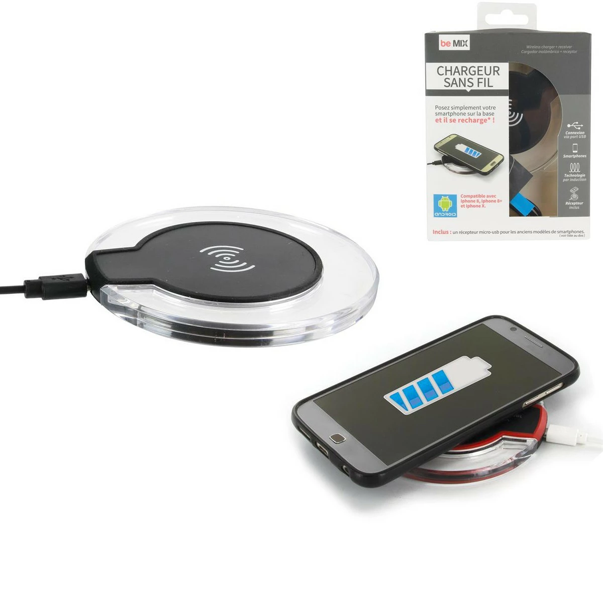 - Compatible norme QI, livré avec patch de transmission, galet de rechargement induction et câble micro-USB,