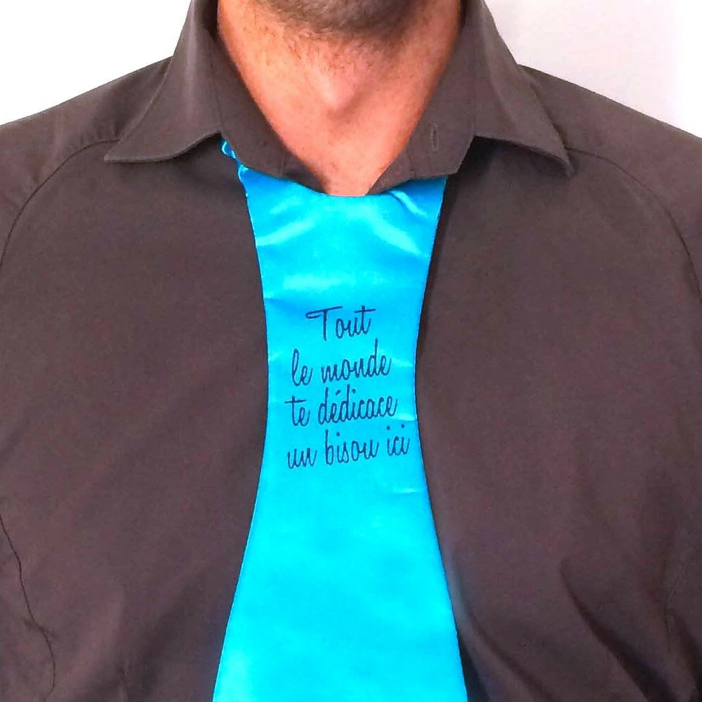 Une cravate comme celle-ci, beaucoup de personnes aimeraient la porter ! Non pas pour son look super kitch mais pour l’utilisation qu’il en est fait : tout le monde (et surtout les filles) doivent dédicacer un bisou sur la cravate !