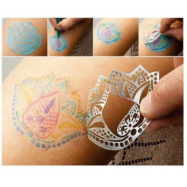 Le principe est très simple et très facile à utiliser : Il suffit de coller le pochoir comme un autocollant sur la peau. Puis à vous de colorer les zones disponibles avec les crayons grâce à l’encre spéciale qui peut être utilisée sur la peau sans problème !