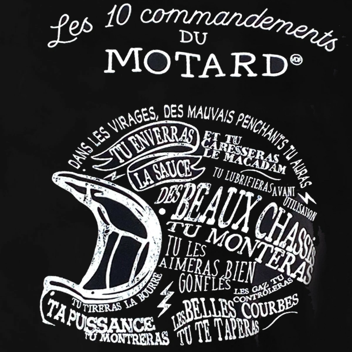 Ce t-shirt humoristique de couleur noire avec son motif en impression blanche comprend les dix recommandations nécessaires au motard, une sorte de bible incontournable du passionné de deux roues. L’ensemble des phrases forme un casque, accessoire vital du motard.