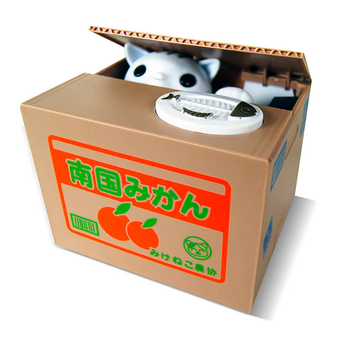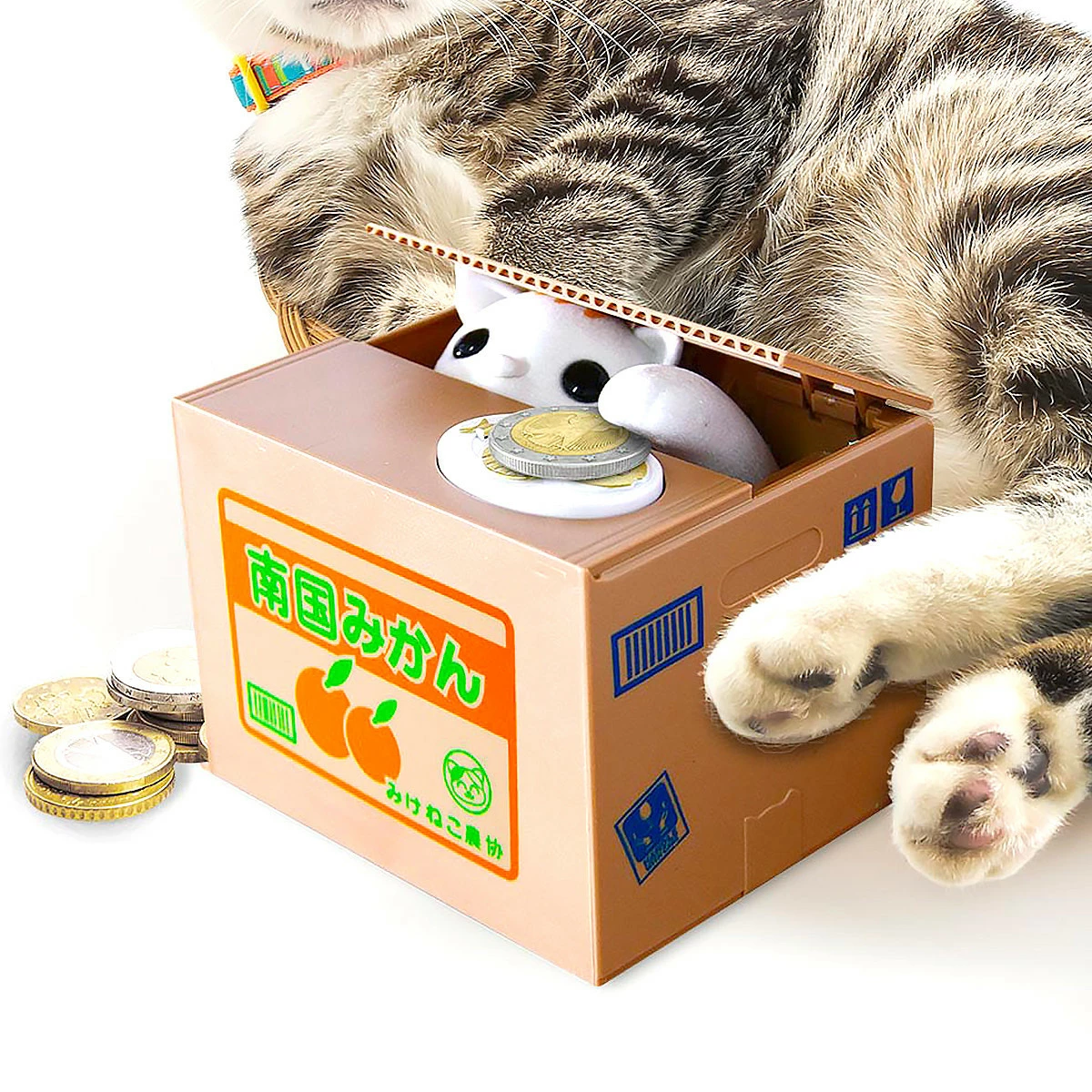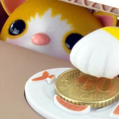 La ressemble à ce scénario : posez une pièce de monnaie sur le poisson au dessus du « faux » carton, le chat miaule une fois, pousse avec la tête un pan de carton et chipe votre pièce avec sa petite papatte ! wahouuu ! Voici une tirelire conçue dans la plus pure tradition japonaise : techno, drôle, ludique et de qualité ! Ce cadeau super original va plaire aux plus jeunes comme aux adultes tant les mimiques du chat sont fidèlement reproduites !